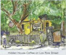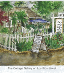 One of the most popular shops in the Los Rios District is the Tea House on Los Rios. Every weekend the Tea House front porch is crowded with mostly women in flowered dresses and straw hats having afternoon tea. The Tea House is in a traditional cottage from the 1800s. At the top of the street is the Cottage Gallery on Los Rios, which is a wood-framed cottage from the 1860s that still has its old kitchen, but is now filled with art. The 40 artists who show their work at the Cottage Gallery are all local to South Orange County, including David Harris Lang, who painted all the artwork in this article.